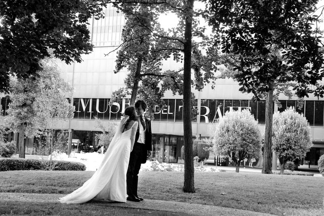 Mientras esperaban a los invitados, los novios tuvieron tiempo de hacerse algunas fotos en los jardines del Museo del Traje.
