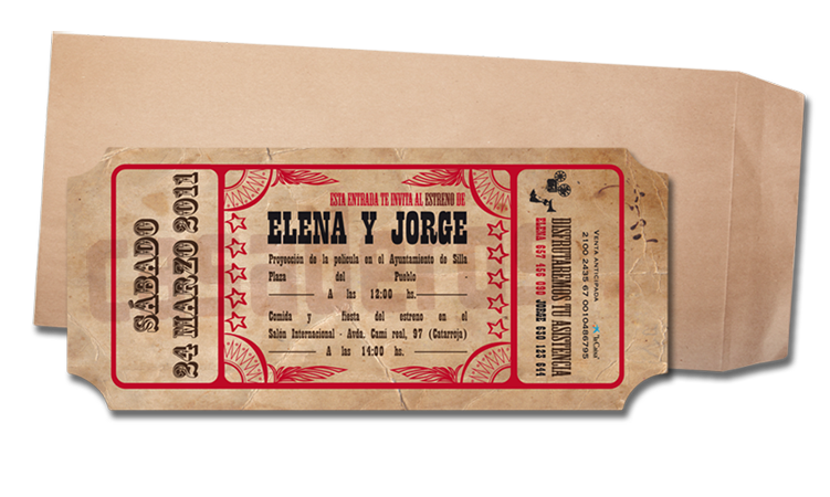 ¿Cómo te gustaría invitar a tus familiares y amigos a tu boda? Casaderos te propone mil y una nuevas formas de hacerlo. Con originalidad y creatividad. Porque cuidas cada aspecto de tu enlace y te gusta mimar todos los detalles. ¿Acaso tu boda no es comparable al mejor estreno de cine? Conoce la variedad de tarjetas que te propone Casaderos, cada una con su estilo propio: entrada de cine, tarjeta de embarque, ticket de compra…