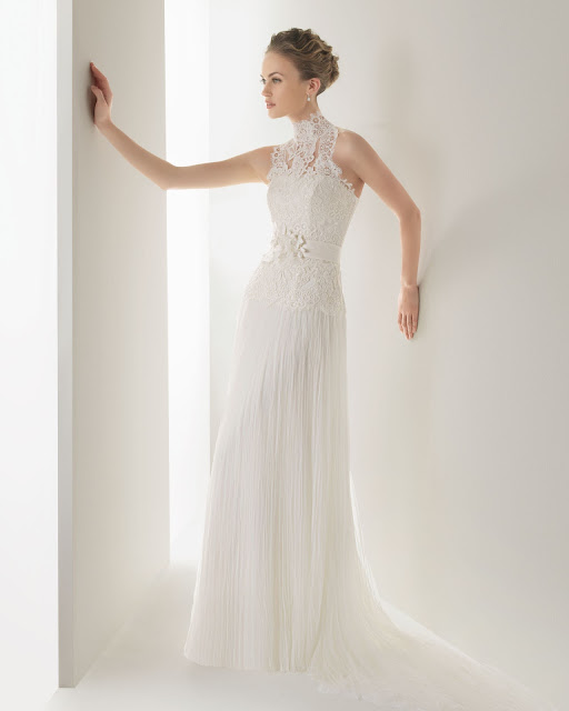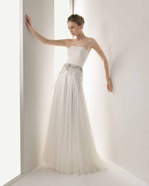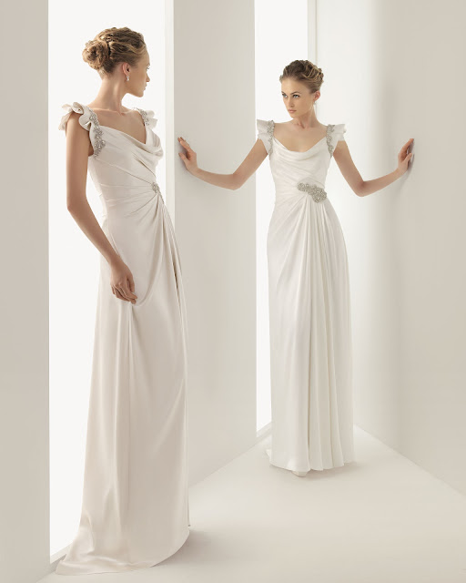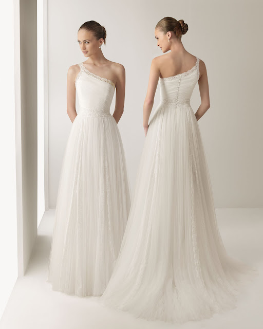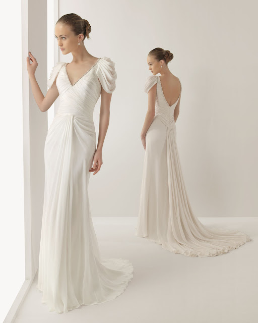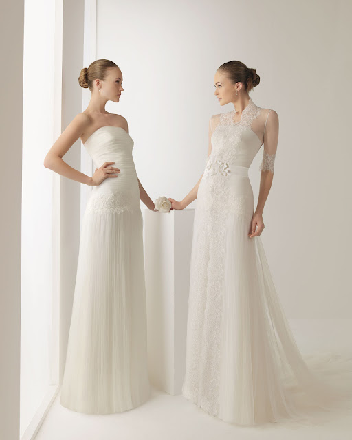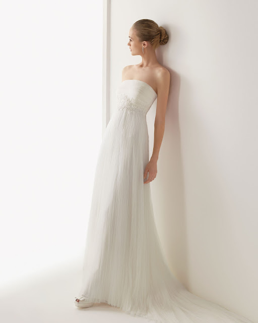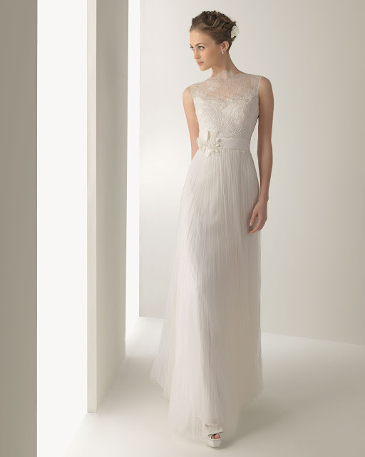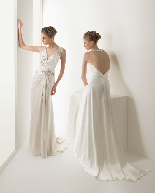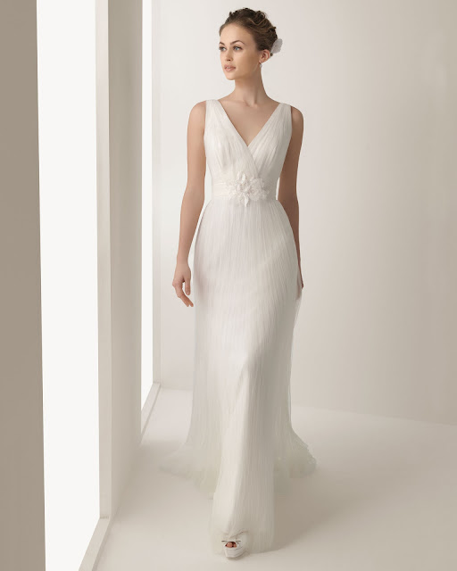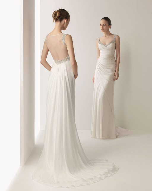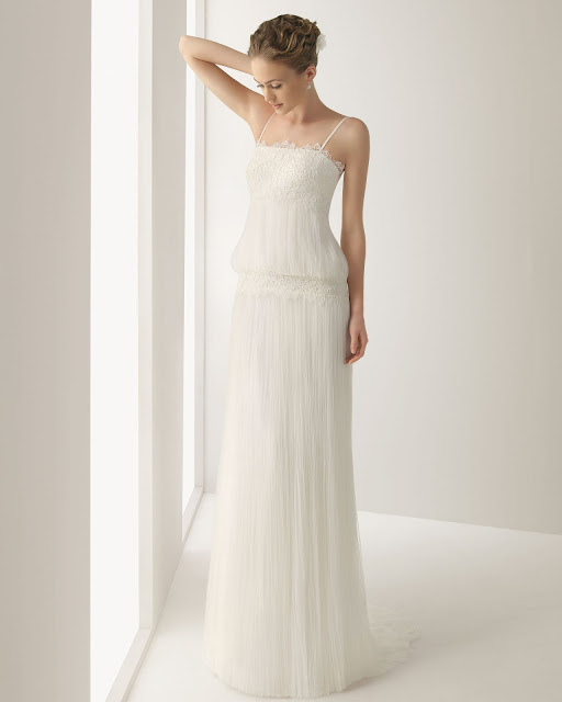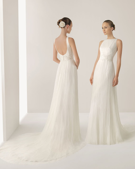 Como para gustos los colores, no todas las novias quieren ir vestidas de princesas y con mucho volumen. Es por ello que Rosa Clará ha diseñado una colección mucho más simple y sin volúmenes. Como indica la firma «Vestidos de gran caída, realizados en tul y voile de seda drapeado de color blanco y nude que se ciñen al cuerpo resaltando la feminidad de la figura.»