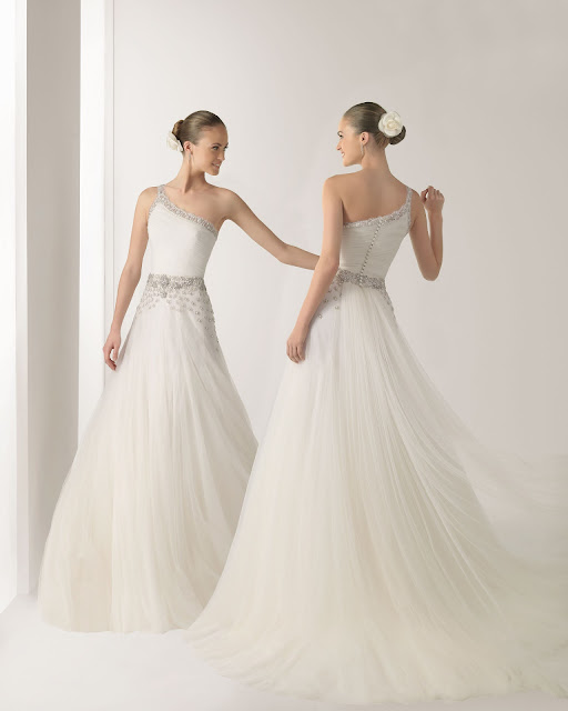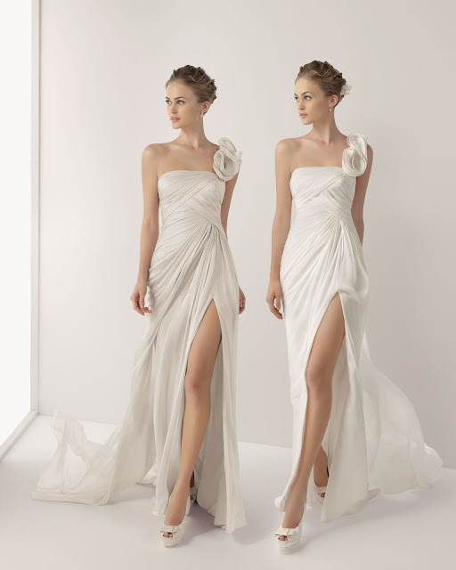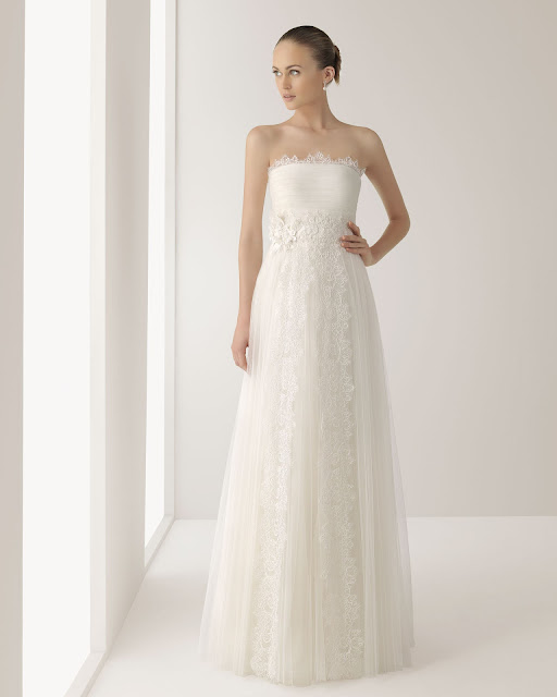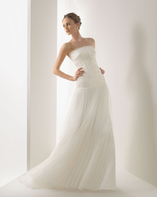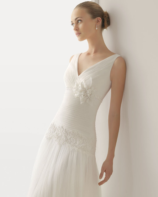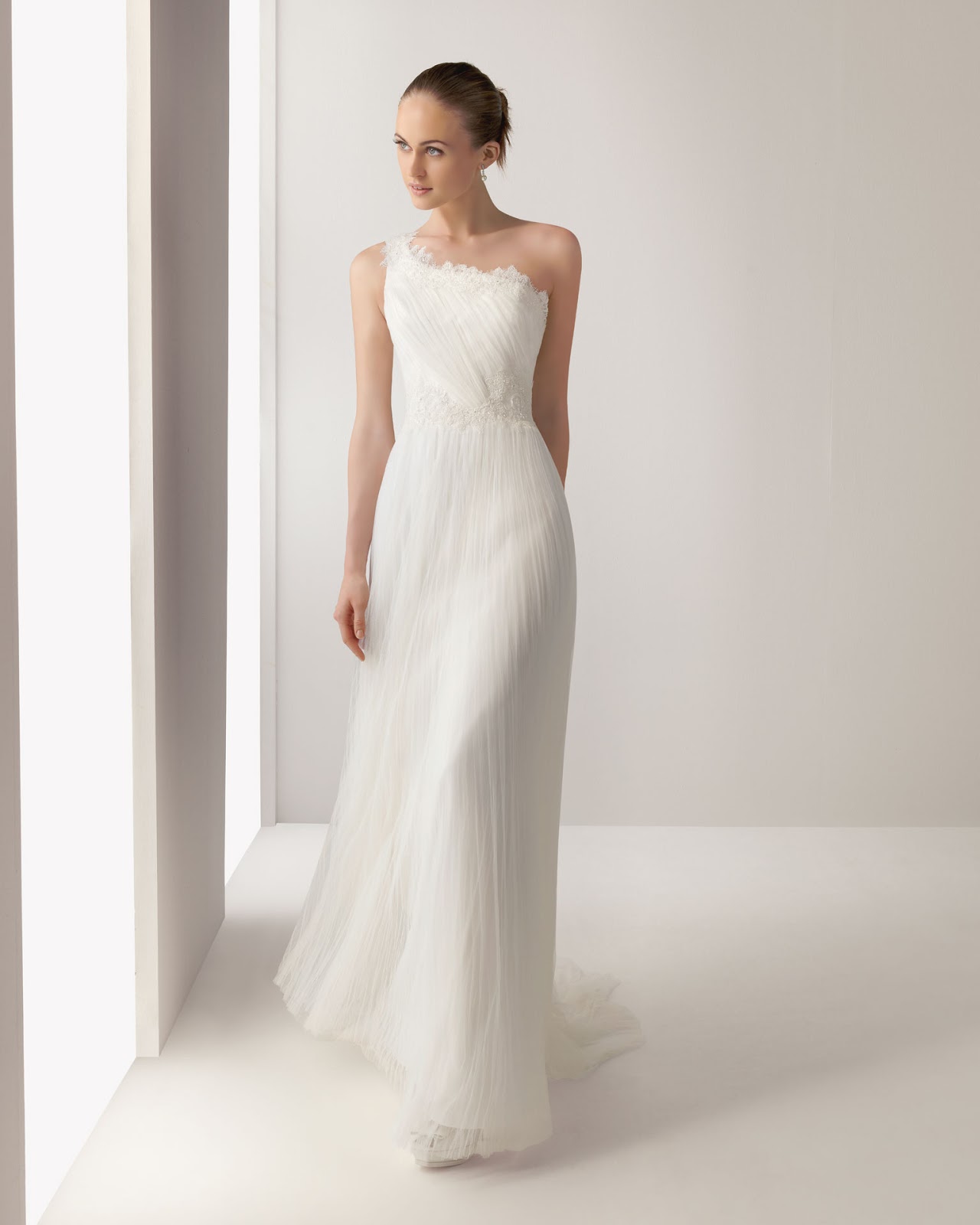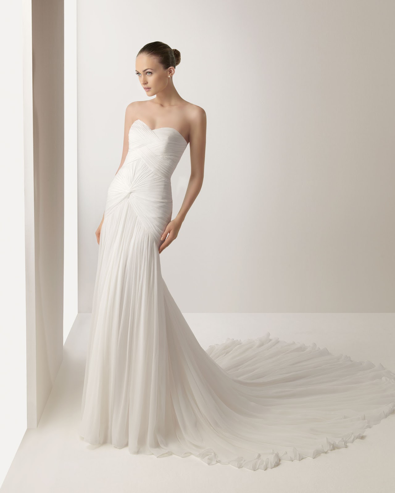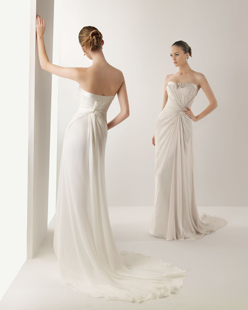 Como para gustos los colores, no todas las novias quieren ir vestidas de princesas y con mucho volumen. Es por ello que Rosa Clará ha diseñado una colección mucho más simple y sin volúmenes. Como indica la firma «Vestidos de gran caída, realizados en tul y voile de seda drapeado de color blanco y nude que se ciñen al cuerpo resaltando la feminidad de la figura.»