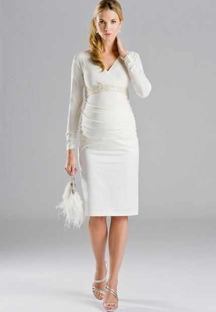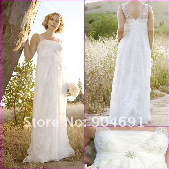 Para mi gusto, lo ideal es un vestido que ciña solo de pecho con un cinturón finito justo debajo del pecho y el resto que sea vaporoso. Así solo marcará la parte de arriba y la tripa quedará disimulada.