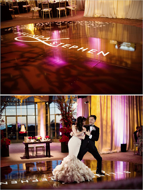 Me encanta el detalle de la tarta colgando, es como un columpio de niños! Además el detalle del nombre de de los novios en la pista de baile da el toque espectacular a la velada.