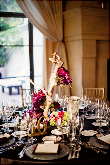Me encanta la decoración de las mesas. Es sencilla y a la vez queda super bonita.La temática de los centros de mesa giraba en torno a ramas secas. En la primera imagen el centro de mesa es una rama seca rodeada de flores en colores fuxia, morado y verde. El mantel de la mesa es negro lo que hace destacar todavía más los centros de mesa. En la segunda imagen continuamos con las ramas secas pero en este caso forman un arbolito que en la copa tiene flores de colores. Queda precioso, ¿verdad?