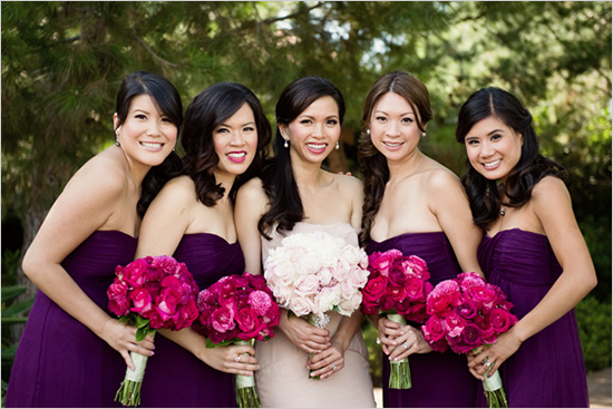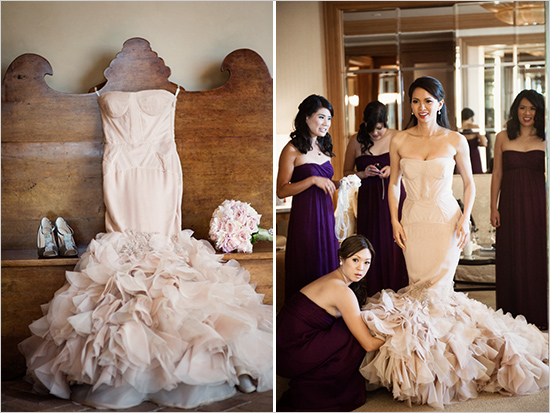 En las primeras imágenes podemos ver detalles de la novia con sus damas de honor. El ramo que llevaba es precioso, un ramo de rosas y peonias en tonos rosa pastel. El traje de la novia no era blanco, sino color maquillaje; un traje sencillo con cuerpo en forma de corset , corte sirena y una cola con mucho vuelo.