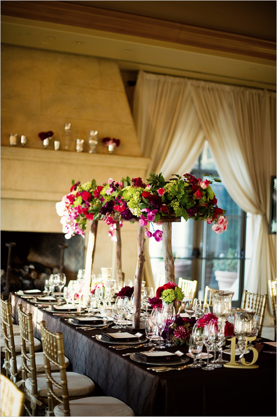 Me encanta la decoración de las mesas. Es sencilla y a la vez queda super bonita.La temática de los centros de mesa giraba en torno a ramas secas. En la primera imagen el centro de mesa es una rama seca rodeada de flores en colores fuxia, morado y verde. El mantel de la mesa es negro lo que hace destacar todavía más los centros de mesa. En la segunda imagen continuamos con las ramas secas pero en este caso forman un arbolito que en la copa tiene flores de colores. Queda precioso, ¿verdad?