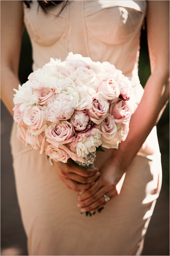 En las primeras imágenes podemos ver detalles de la novia con sus damas de honor. El ramo que llevaba es precioso, un ramo de rosas y peonias en tonos rosa pastel. El traje de la novia no era blanco, sino color maquillaje; un traje sencillo con cuerpo en forma de corset , corte sirena y una cola con mucho vuelo.