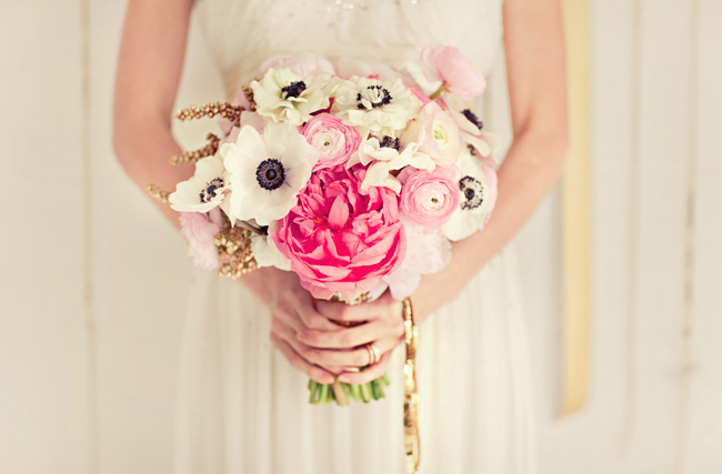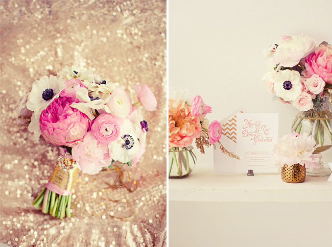 El ramo de la novia de ranúnculos, peonias y anémonas y ramas en oro atado con una cinta dorada y rosa y decorado con un broche antiguo. En la imágen de al lado un detalle de las invitaciones y de los jarrones que decoraban la estancia, todo con las mismas flores que el ramo de la novia.