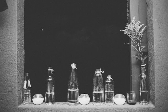 Detalle de una de las estancias del salón, botellas con agua decoradas y velas. Tu también puedes hacerlo, solo tienes que ir guardando botellas usadas y en la boca de la botella atas cuerda o lazos…lo que quieras!