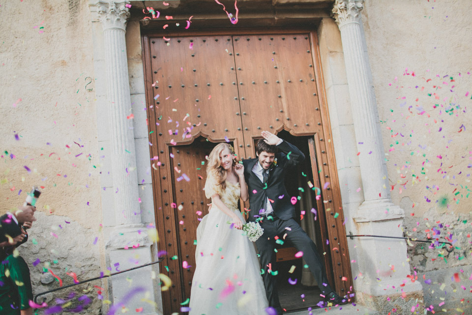 La salida de los novios de la iglesia no fue con arroz, fue con confetti!