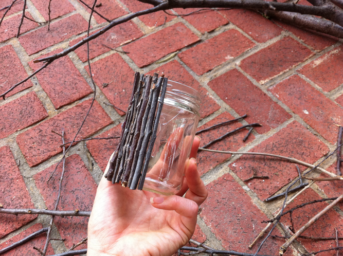 Ir pegando las ramitas al tarro una al lado de la otra sin dejar apenas hueco.