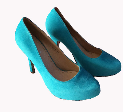 Para los pies elegí unos tacones de color turquesa para que le dieran contraste al vestido. Son de www.calzadosestuko.com
