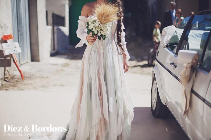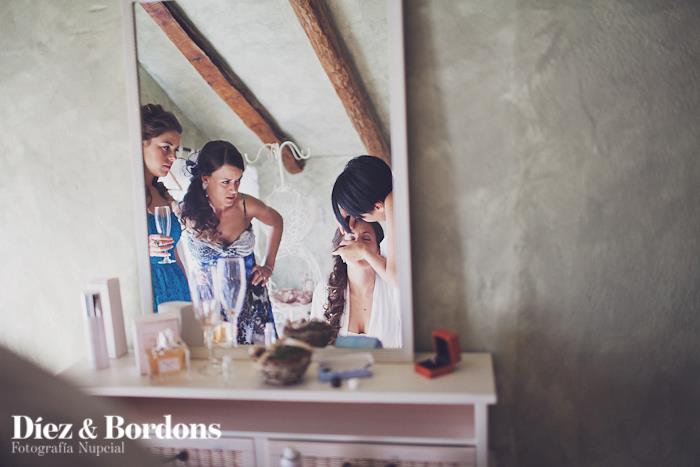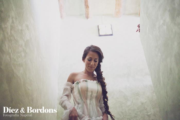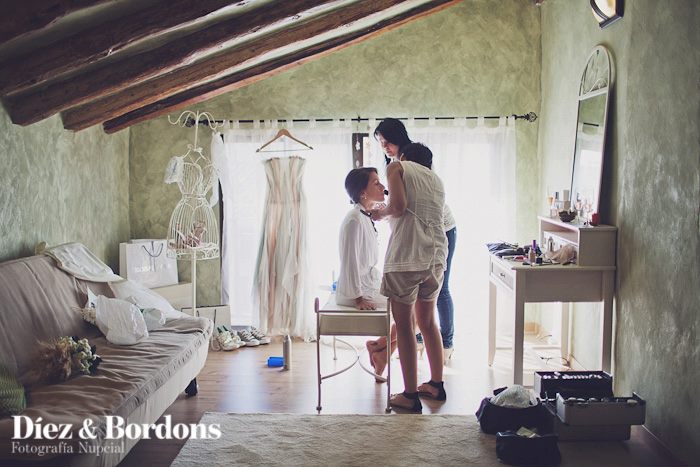 Pues fue la mejor de las decisiones de mi boda, mis padres se compraron una casa que estaba prácticamente en ruinas en el pueblo natal de mi padre, durante un año se dedicaron a reformarla, pero hay un espacio en concreto que era la antigua cámara abuhardillada situada en la segunda planta que a mí me encantaba. Mi padre se dedicó en cuerpo y alma para ponerla apunto, la reformó y rehabilitó conservando las vigas de madera, colocó una instalación eléctrica vista de aspecto antiguo, parquet en el suelo, y pintó las paredes de estilo rústico en el color verde que yo misma escogí. Allí coloque mi vestidos de novia, zapatos (que tenía tres pares jajajaja) preparé un tocador con un precioso espejo, y aprovechamos viejos objetos de la casa como arcones y material de labranza para decorar la estancia. Allí me peinaron mis peluqueras que vinieron desde Valencia, y mi maquilladora que también se desplazó para la ocasión. Tengo un recuerdo precioso de ese día y de ese lugar en concreto, puesto que esas horas previas al enlace preparándome y vistiéndome fueron las mejores.