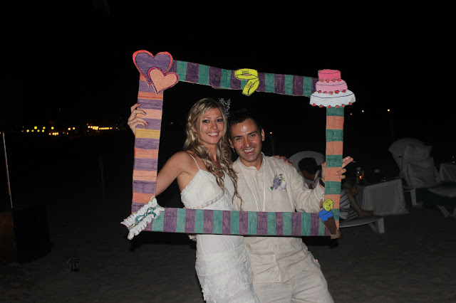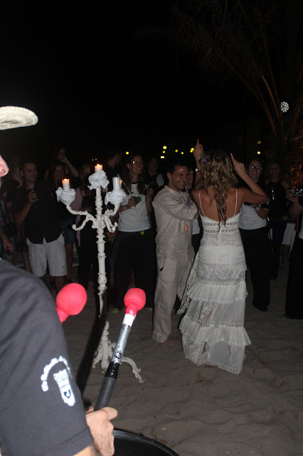 Por la noche, montamos una fiesta en un chiringuito de la playa de Calafell. Invitamos a unos 70 amigos, y la idea era bailar hasta que los pies dijeran basta. El chiringuito estaba decorado con velas blancas, sofás, palmeras y nos acompañaba la música en directo de un amigo DJ. La fiesta fue muy divertida, entre risas, abrazos con amigos, charlas,…y de repente escuché un estruendo de tambores en la calle. Pensé, mira, una batukada que pasa por la calle, era verano, quizás iban a algún concierto. Cuál fue mi asombro cuando la batukada entró al chiringuito e inundó de fiesta y ritmo. Mientras estaba absorta sin entender nada, Toni se acercó a mi oído y me susurró: sorpresa… Y tan sorpresa!! Nos pusieron a los dos en medio de un círculo, nos hicieron dirigir la banda, bailar,…acabamos metiendo a nuestros amigos en medio de la banda para acompañarnos con los bailes y vimos como amigos de ambas partes bailaban unos con otros como si fueran un solo grupo de amigos de toda la vida!