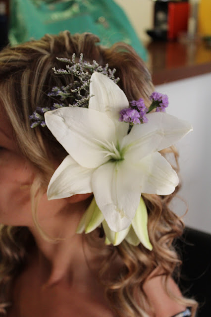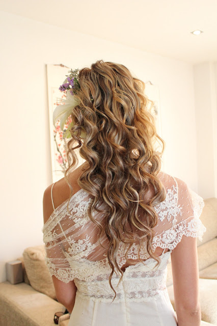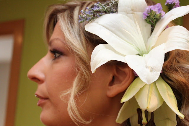 Como complemento para mi peinado, fui a mi floristería de toda la vida, ya que la dueña es también amiga y en una tarde escogimos entre las dos las flores del ramo con la idea de que fueran las mismas para mi tocado. Quería llevar flores naturales en el pelo, para que desprendiera la naturalidad que envolvía a ese día tan especial. Lilium y florecitas lilas, ya que mis colores preferidos son el color lila en combinación con el beige.