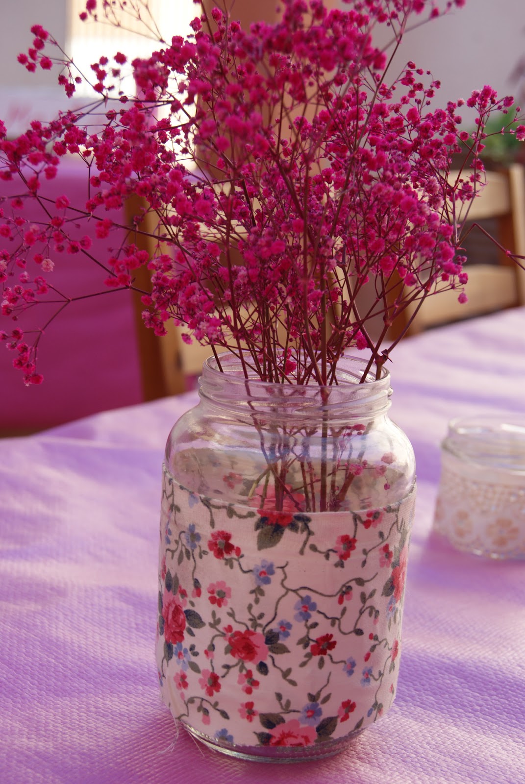 Así que pensé, que para darle un toque de color, el rosa quedaría bonito, por lo que me puse manos a la obra para que todo estuviera en ese color. Lo primero que hice fue reclutar tarros de cristal para poder hacer mis centros. Paralelamente busqué una tela de flores con algún tono en rosa para el photocall y con la misma tela hice las guirnaldas y los centros de mesa. (Esta semana os enseñaré como hacer los centros de mesa de forma súper rápida).