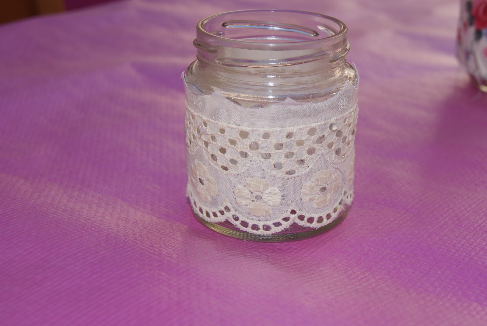 Otros tarritos pequeños forrados con puntilla blanca y que en su interior tenían pequeñas velas que iluminaron toda la velada.