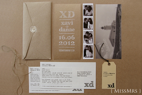 Fueron diseñadas por ellos mismos. Los sobres eran de papel craft tamaño americano y cerrados con un sello de lacre de color blanco nacarado. Dentro contenía diferentes indicaciones. Una cartulina con una estampación en blanco hecha por los novios con un sello de goma. Una tira con 4 fotos de ellos mismos en blanco y negro. Una postal de su faro favorito donde detrás había un cuestionario para los invitados que luego tenían que enviar a los novios antes de la boda y una pequeña etiqueta. Todo ello atado con cuerda y metido dentro del sobre. ¿ No os encanta? Porque a mi me tienen enamorada….