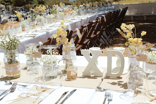 Eran rectangulares y tenían una distribución simétrica en forma de U con los novios en el centro. La iluminación fueron bombillas pequeñas alternadas con banderolas: total look de fiesta de pueblo, increíble, ¿verdad? La decoración de las mesas era un mantel de tul encima del mantel blanco, y un camino de mesa de color natural en el centro. Los centros de mesa eran botes de vidrio de diferentes tamaños. Escogieron la paniculata, siempreviva y ramas de olivo que ellos mismos cogieron del campo. En los botes más pequeños pequeños pusieron velas que encendieron por la noche y algo original y útil para los fumadores: tarritos con arena a modo de cenicero.