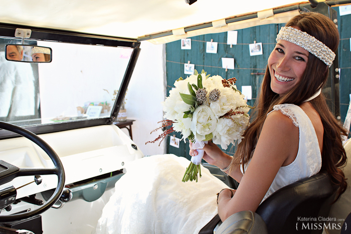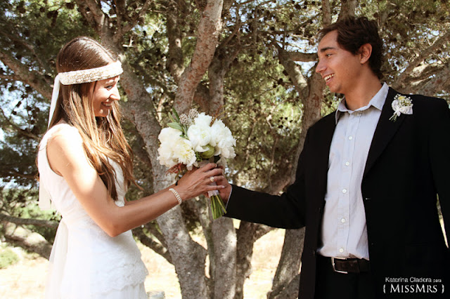 El peinado de Danae fue muy sencillo. Unas ondas naturales que con la cinta de perlas y brillantitos quedaba genial con el vestido. La cinta fue obra de Yolancris. El ramo era de peonías blancas con hojas verdes y ramitas marrones que le entregó su hermano momentos antes de marcharse todos hacia el ayuntamiento.