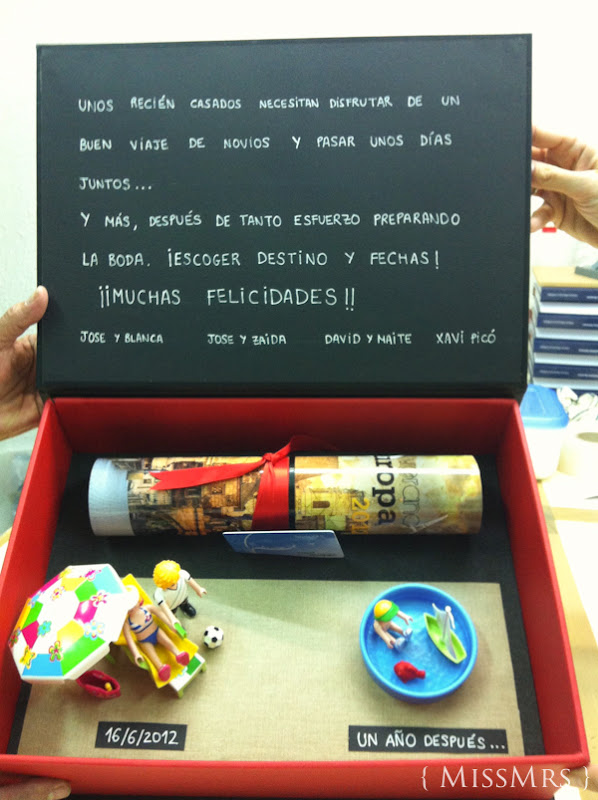 Danae y Xavi no contaban con un viaje de novios ya que se gastaron todo su presupuesto organizando su deseada boda.Pero unos amigos en la fiesta blanca del día anterior a la boda les hicieron un súper regalo:un vale del Corte Inglés canjeable por un viaje y mirar en que cajita tan original se lo regalaron!