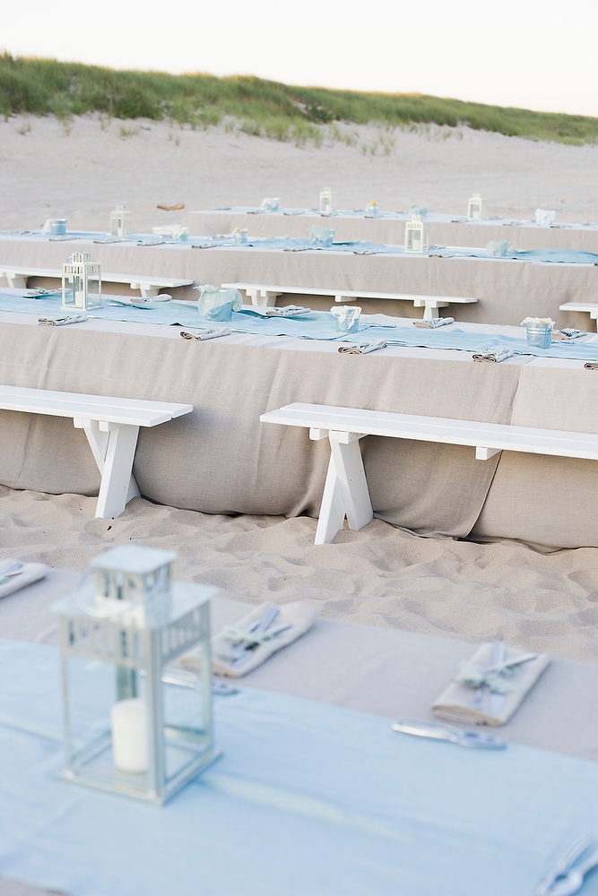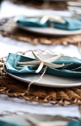 Me encantan los tonos azul agua para decorar una boda y si lo mezclas con beis la combinación es super bonita. Para completar podéis poner encima de las servilletas una concha, estrella…