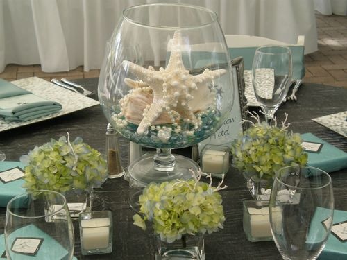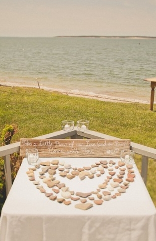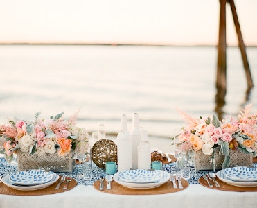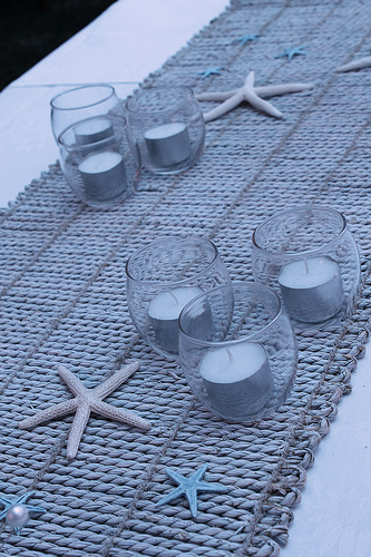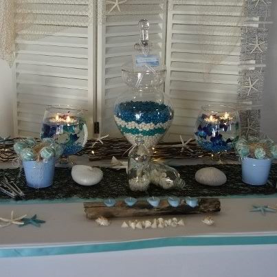 Como material para este tipo de bodas os recomiendo: arena, conchas, caracolas, estrellas, botellas de vidrio ( como mensaje en una botella), cuerda de amarre, anclas, el color azul marino, el azul turquesa, piedras de playa, madera encontrada en la playa….