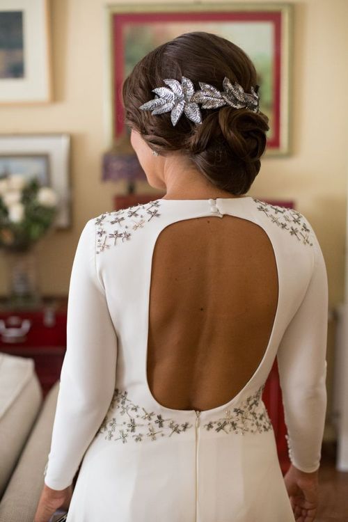 Silvia se prepara para un día inolvidable, el de su boda. La novia llevaba un precioso vestido hecho por Carmen Osuna de COLOR NUDE de manga larga y con un enorme escote en la espalda que me encanta! El tema del vestido era las libélulas que decoraban todo el vestido de una manera exquisita. Además la forma en que se cosieron tenía un significado, el nº 8, un número con mucho significado para la pareja que también marcó el resto de la boda. Si os fijáis en la espalda se cruza el número 8.  El tocado es de CHERUBINA de la colección ANI BÜRECH. ¿No os parece espectacular? A mi me encanta. Es como una corona griega, y queda perfecta con el moño bajo con ondas que llevaba Silvia.
