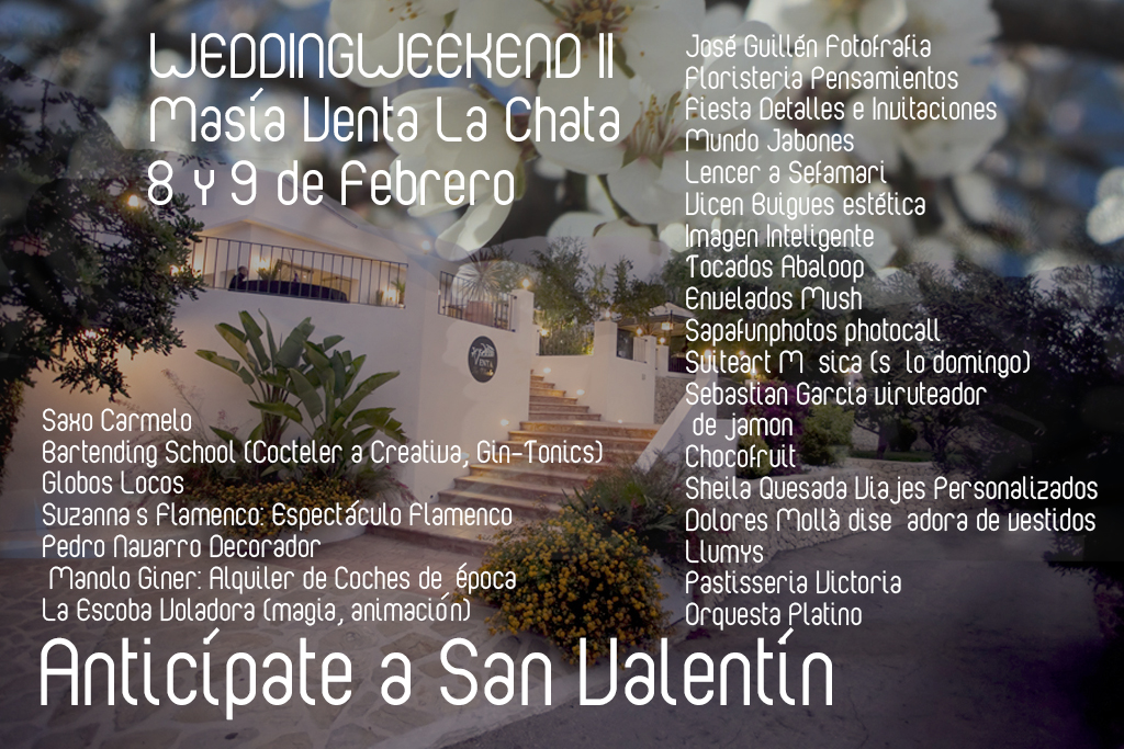 II Wedding Weekend en Masía Venta La Chata: Sábado 8 de Febrero de 16:00 a 21:00, Domingo 9 de Febrero de 11:00-21:00.