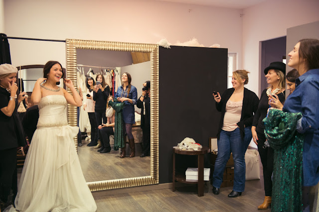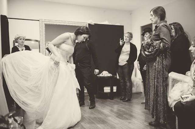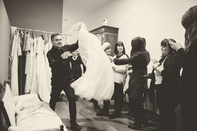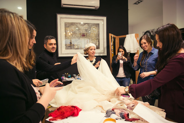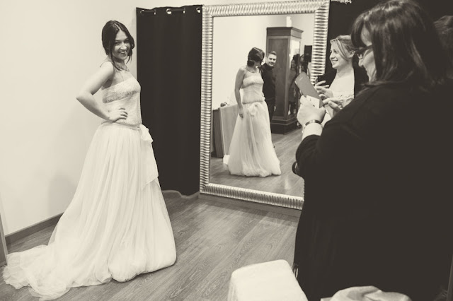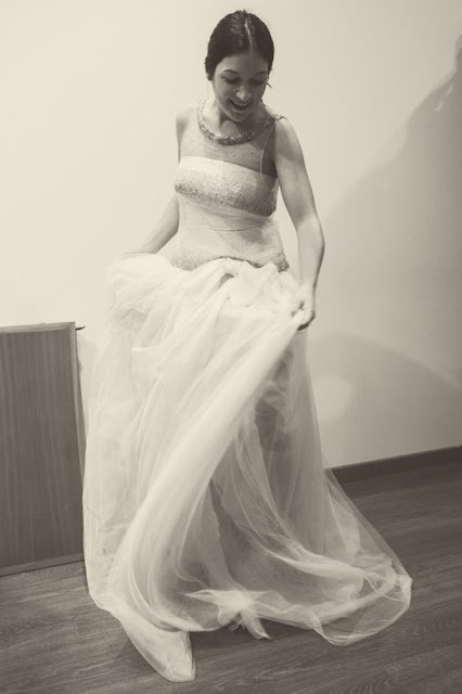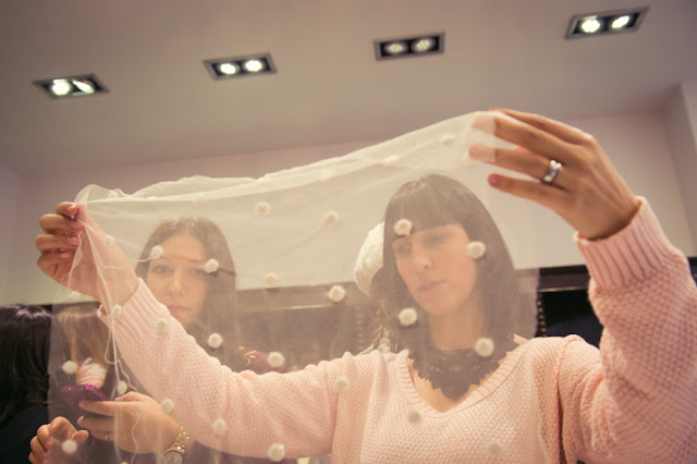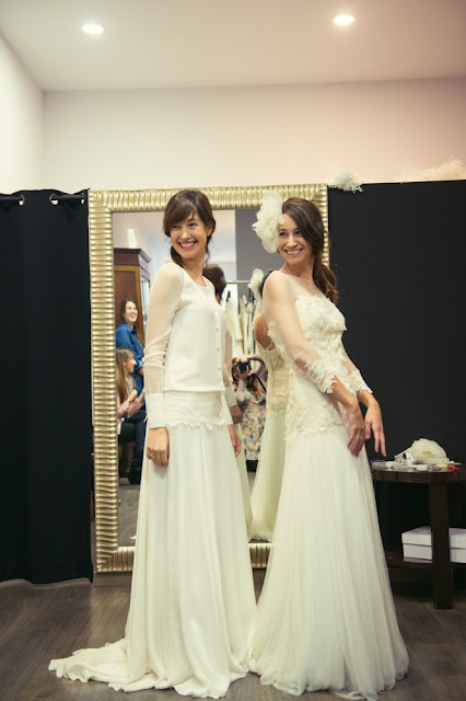 Acto seguido pasamos a ver algunos de los diseños que ha diseñado para novias y nos ofreció probarnos uno de sus diseños, y ¿A que no os imagináis quien se presentó voluntaria? Pues si, servidora jajaj Me apunto a todo, y me hacía mucha ilusión poder vestirme de blanco.